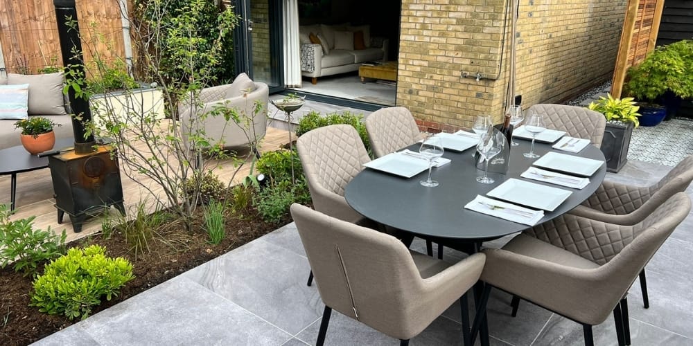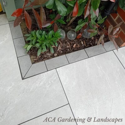 This fresh, modern garden replaces a once dreary, dated space with a bright Sierra Grey porcelain patio and Polar Ice chippings, all tied together with clean metal edging. Designed by Mistletoe Garden Design and completed by our landscape division, the result is a contemporary outdoor space that flows effortlessly from the home.