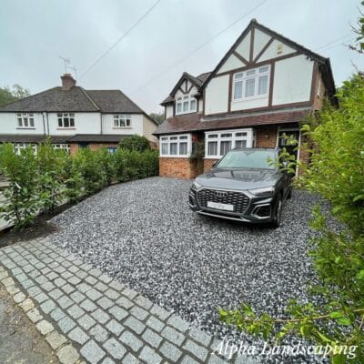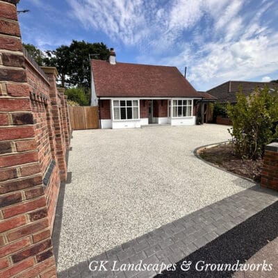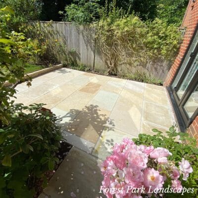 This sloping garden has been transformed into a beautifully tiered retreat featuring Sinai Pearl Egyptian Limestone paving, Yorkshire Cream decorative aggregates and Wienerberger bricks. With two patio levels connected by a stepping-stone path, the garden now combines structure, charm and effortless flow.