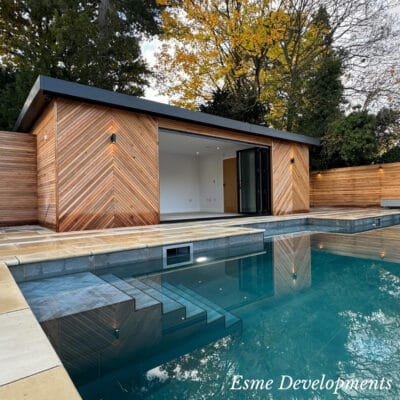 This stunning garden transformation centres around a spacious new patio that flows elegantly around a pre-existing pool. Crafted from Sinai Pearl Egyptian Limestone with bespoke bullnosed copings and steps, the result is a sophisticated, multi level outdoor space with beautifully connected zones.