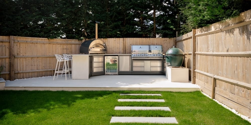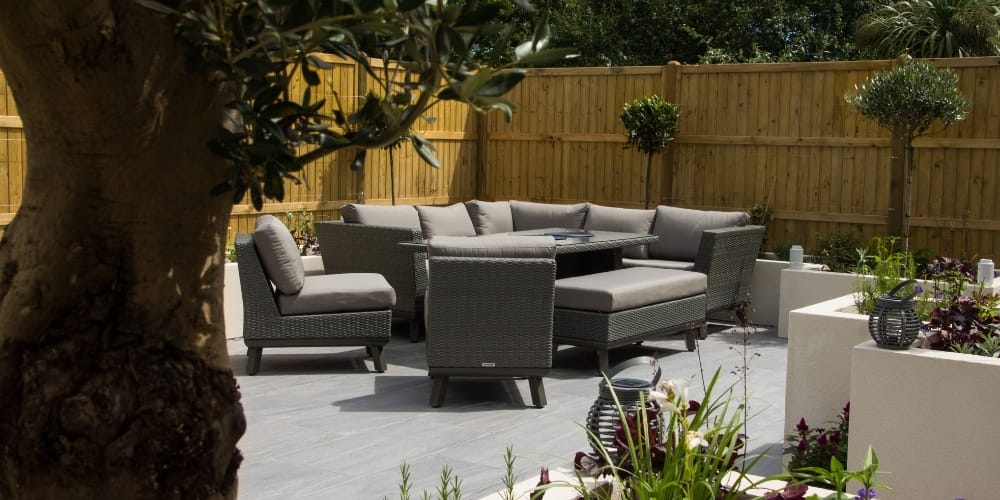 This modern family garden features a Pro Venus Pearl porcelain patio, defined by slate borders, and soft natural accents- creating a clean, contemporary layout perfect for both play and relaxation.
