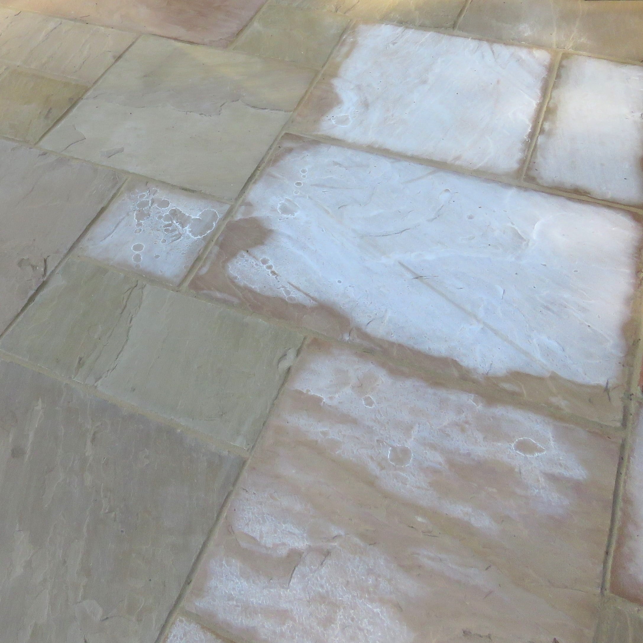 Blooming, efflorescence and ‘salting’ are chemical reactions often found in concrete and some natural stones. Naturally occurring salts or deposits in the paving are dissolved in water and make their way out to the surface of the slab. The result is white patches which can be powdery or crystal-like. It can occur spasmodically over time and is more likely when paving is wet and takes a long time to dry.