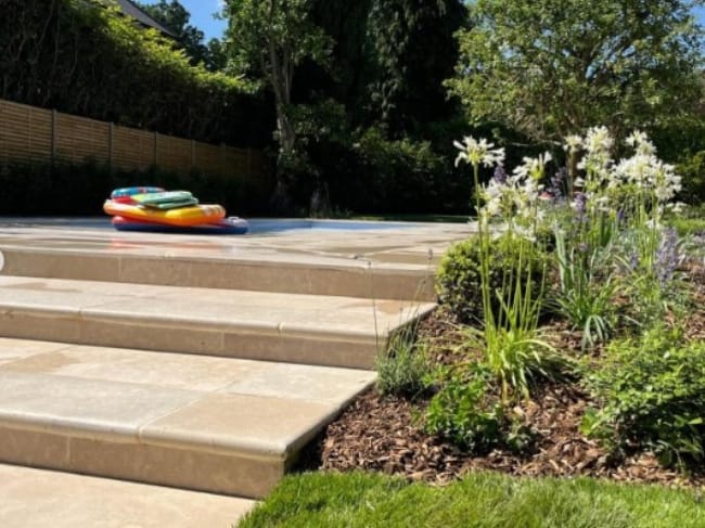 Natural stone paving such as limestone or sandstone works best for an authentic look. Porcelain is also a great option is you want a low-maintenance alternative with similar aesthetics.