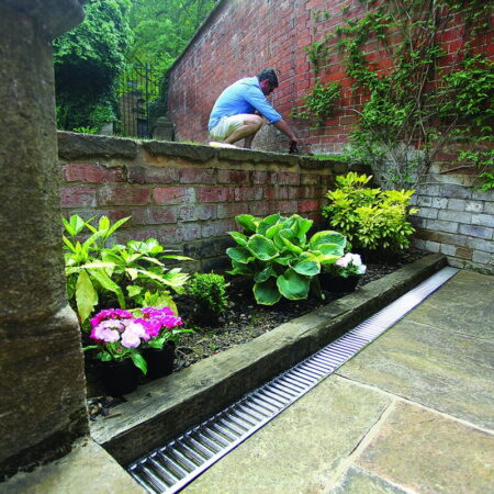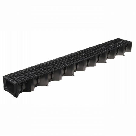 Channels are manufactured from recycled polypropylene and available with either a black plastic or a galvanised steel grating. Corner units are available and have a vertical outlet. End caps and sump units are also available.