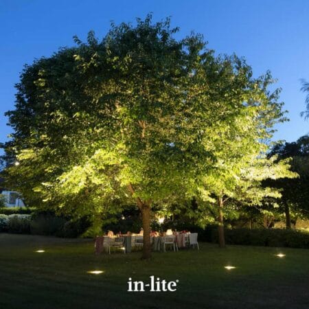 The in-lite® BIG NERO tilting recessed uplighters produce a strong but wide 49° beam of light that projects up to a distance of 6.5m. Unlike the smaller NERO, they feature the in-lite® Motion technology, allowing their tilting modules to be adjusted, using just the provided magnet to achieve the desired lighting effect. This makes them perfect for uplighting large walls, sides of buildings and all types of trees, with multiple fixtures recommended for larger trees. Thanks to their wide, flat bezel, they can be installed in gravel, grass, stone, concrete or wood. They require a Ø142mm cut-out if used in solid materials.