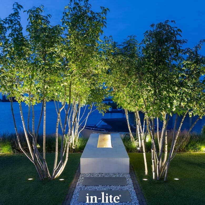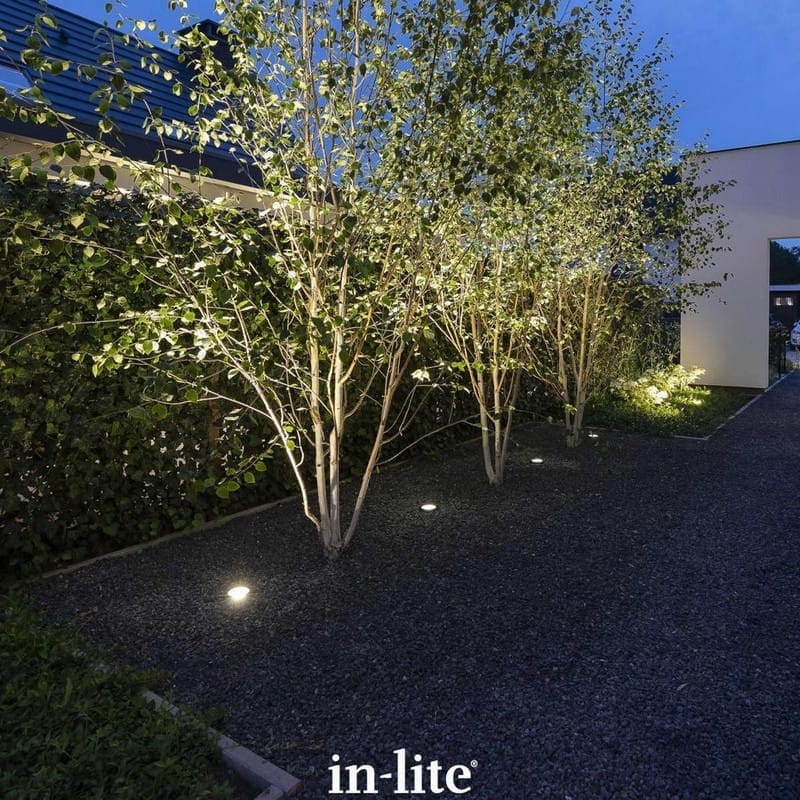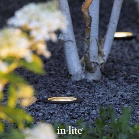 The in-lite® NERO recessed uplighters produce a strong and focused 25° beam of light that projects up to a distance of 8m. This makes them perfect for uplighting all types of trees, with multiple fixtures recommended for larger trees. Thanks to their wide, flat bezel, they can be installed in gravel, grass, stone, concrete or wood. They require a Ø116mm cut-out if used in solid materials.