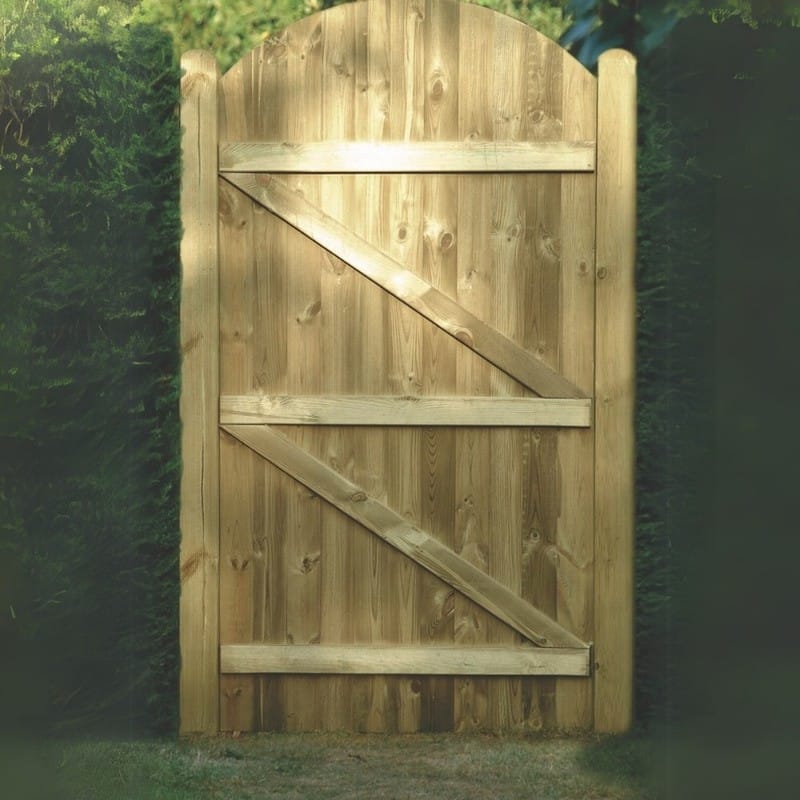 KDM Elite Tongue and Groove Gate. Ledged & Braced with an arched top 1.8m high x 0.9m wide. Made from sustainably sourced timber.