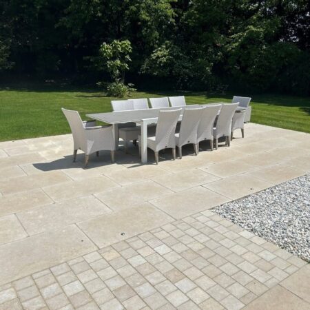 Kebur Contempo Sinai Pearl Egyptian Limestone paving has been honed and tumbled with sawn edges to create a sleek and smooth beige limestone paving.