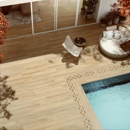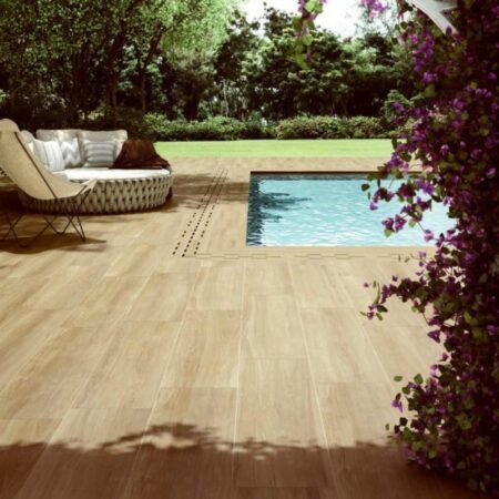 Contempo Stylewood Almond is a light brown Porcelain Paving is supplied in a plank format 1200 x 300 x 20mm nominal size*. Stylewood Porcelain paving is a quality Italian timber-effect porcelain with a lightly textured surface and extremely realistic grain. Enjoy the look of timber in your garden without worrying fading, splitting or slippery surfaces or all the associated maintenance.