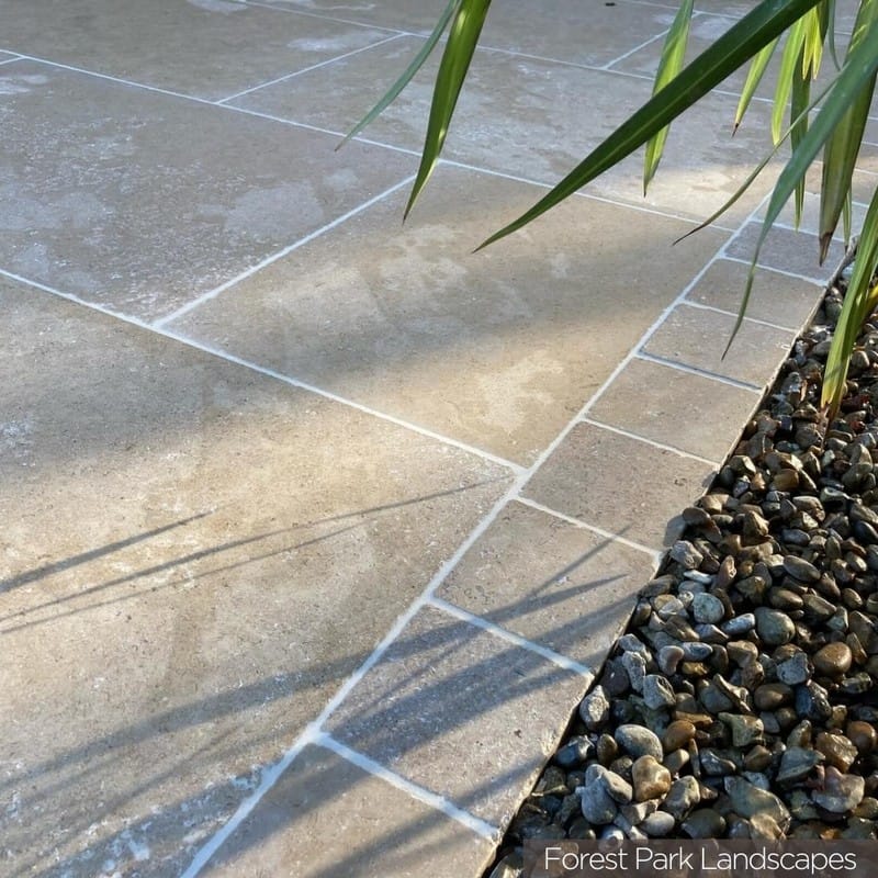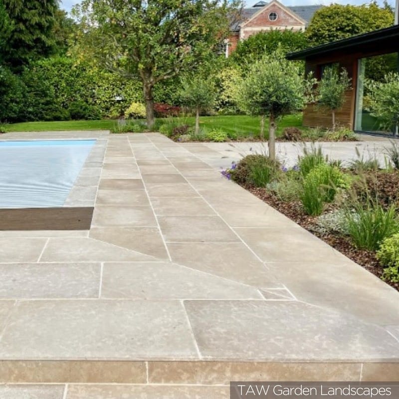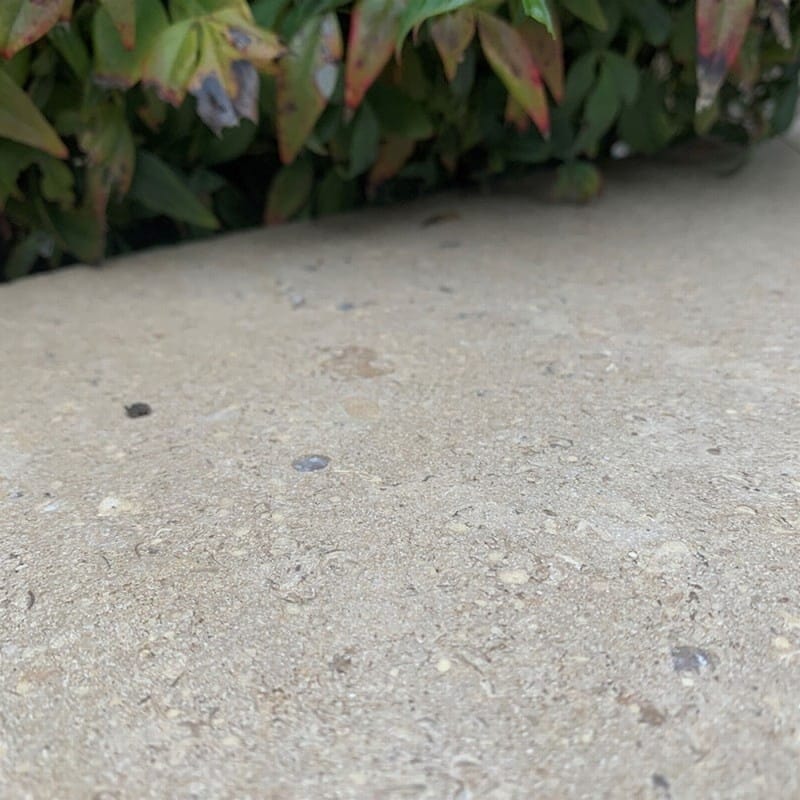 This Kebur Contempo Egyptian Limestone Sinai Pearl paving has been tumbled and then etched with an acid wash to create a lightly textured surface. The washing process also enhances the colour of the stone and so it generally appears darker than the honed and tumbled version.