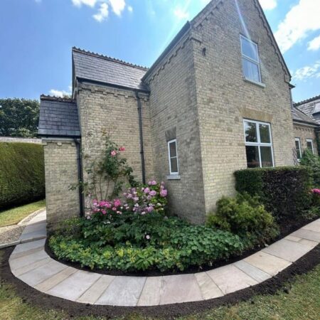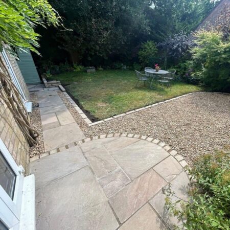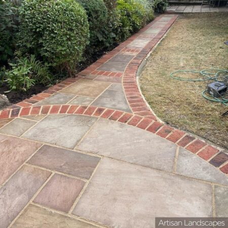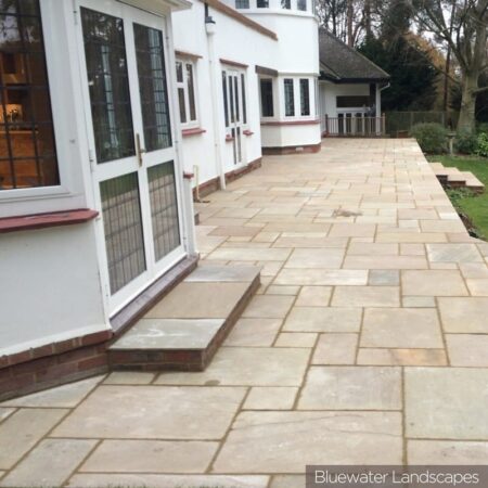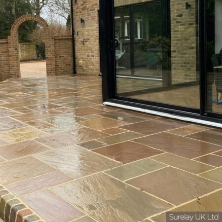 Raj Green Sandstone paving is a hugely popular choice for its olive green, brown and grey shades and its natural veining.