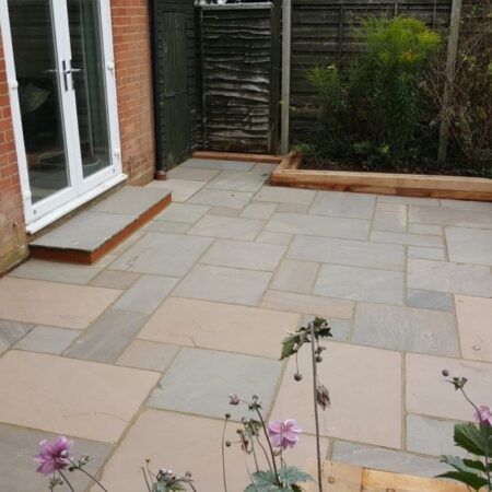 This natural Indian Sandstone, also known as Raj Blend paving, has a natural lightly riven texture with handcut edges. Raj Green paving can give a stunning traditional finish and can also suit contemporary designs. Like all our Natural Stone Trade Packs, we carefully source this stone to give you outstanding quality and value. Slabs are calibrated to 22mm, giving them an even thickness. This makes laying easier. Raj Green Sandstone is available in a convenient mixed size patio trade pack. Each trade pack covers 15.3m2 and contains 13 of 900×600, 13 of 600×600, 13 of 600×290 and 9 of 290x290mm slabs.