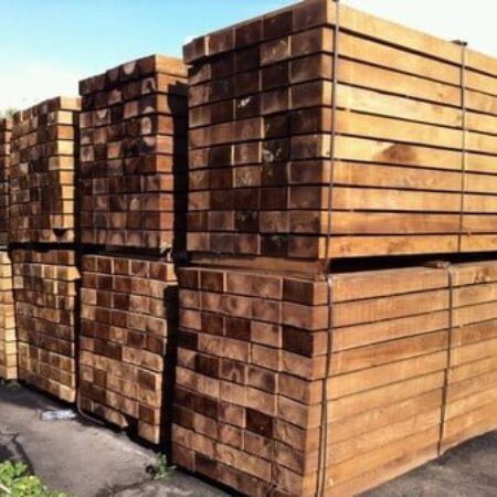 New treated brown hardwood sleepers are either Alder, Aspen or Birch. These sleepers have more consistent edges and less splitting than oak sleepers. Pressure treated brown.