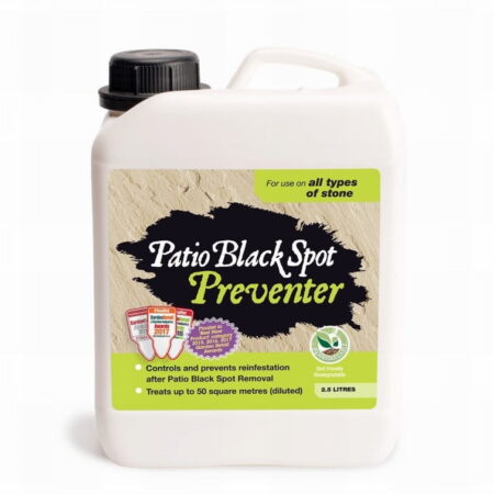 Black spots are stubborn and even hours of pressure washing will not remove them. The more you pressure wash, the more you damage the surface of your stonework leaving it porous and susceptible to frost damage. Patio Black Spot Remover will remove the black spots, and Patio Black Spot Preventer will control and prevent their return. There are specific Patio Black Spot Remover formulas for natural stone, artificial stone and block paving. All are available in either 2 or 4 litre bottles. There is also a 2.5 litre bottle of preventer that can be applied annually maintain the condition.