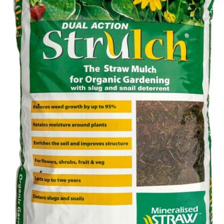 Strulch ® is a high quality, light and easy to use garden mulch made from wheat straw with added iron minerals for organic gardening. A patented process is used to ‘preserve’ the straw so it lasts for up to two years and gives an earthy brown colour. Strulch has a neutral pH and is recommended by the RHS and used at the RHS Gardens in Wisley. Strulch is suitable for use throughout the garden on: borders, raised beds, around cultivated fruit and on vegetable plots.